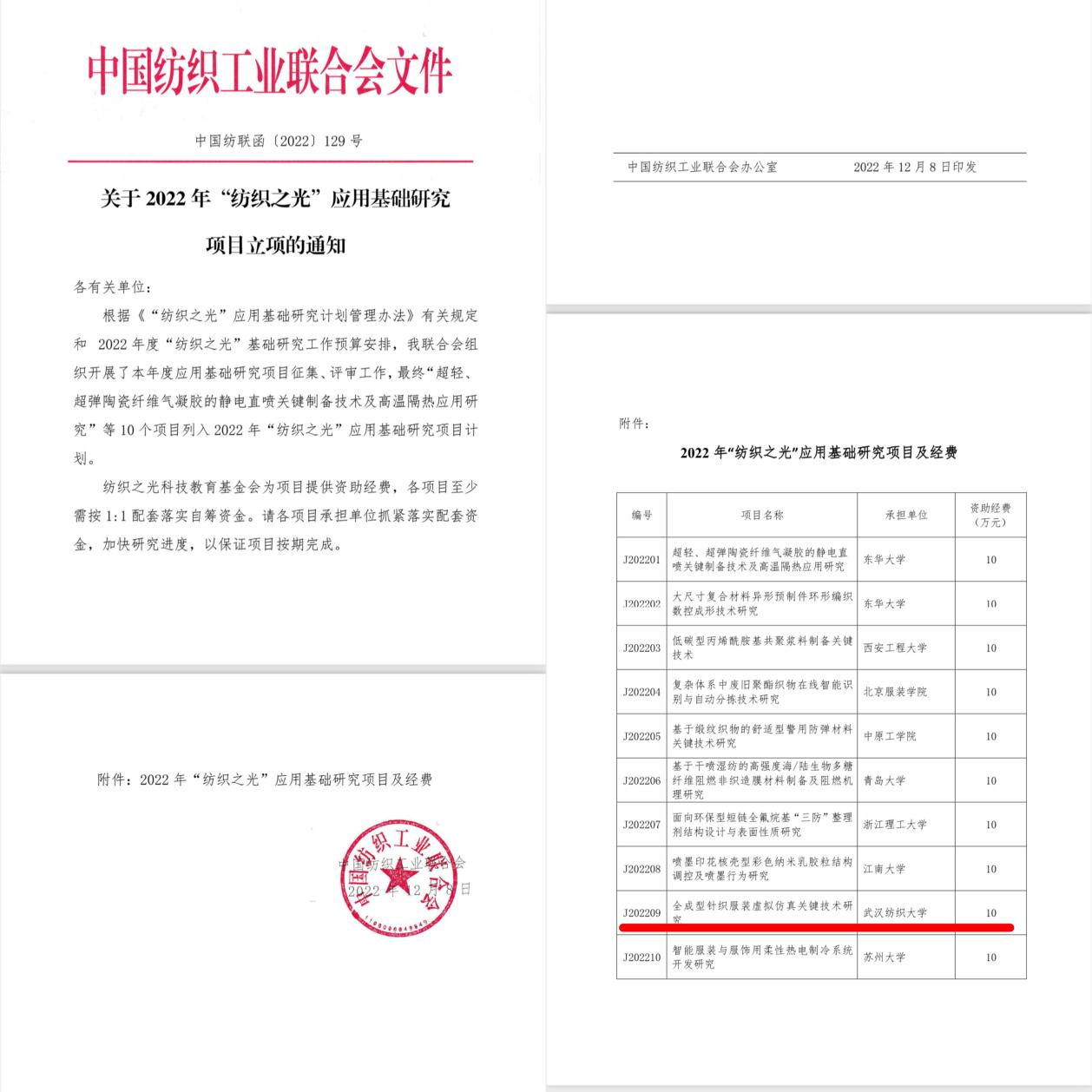 近日,中国纺织工业联合会公布了全国2022年度“纺织之光”应用基础研究立项项目名单,色情直播app 胡新荣教授主持的“全成型针织服装虚拟仿真关键技术研究”获得资助(全校唯一)。